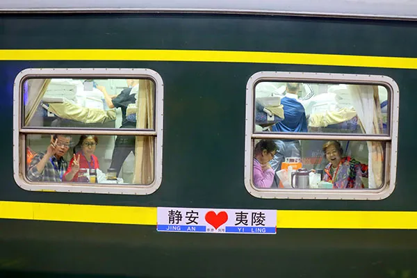 ■5月18日20时,满载400多名上海游客的“静安·夷陵号”旅游专列,徐徐驶出上海火车站,发往湖北夷陵。这是上海对口支援夷陵29年来的首趟旅游专列。